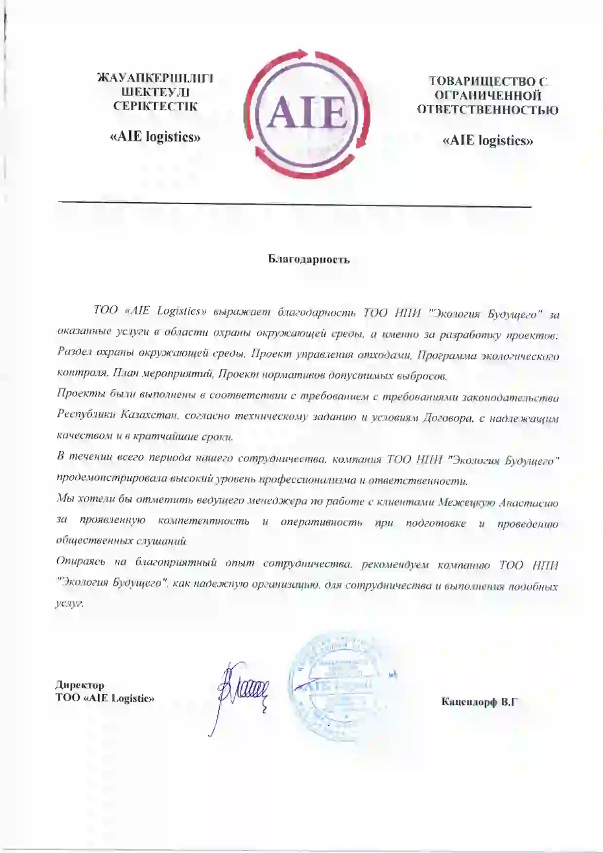 ТОО «AIE Logistics» выражает благодарность ТОО НПИ "Экология Будущего" за оказанные услуги в области охраны окружающей среды, а именно за разработку проектов: Раздел охраны окружающей среды, Проект управления отходами, Программа экологического контроля, План мероприятий, Проект нормативов допустимых выбросов.